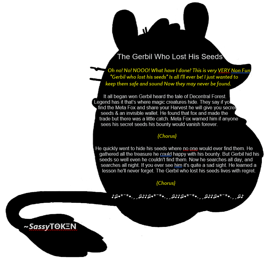The Gerbil Who Lost His Seeds Oh no! No! NOOO! What have I done? This is very VERY Non Fun. "Gerbil who lost his seeds" Is all I'll ever be! I just wanted to keep them safe and sound Now they may never be found. It all began wen Gerbil heard the tale of Decentral Forest. Legend has it thats where magic creatures hide. They say if you find the Meta Fox and share your Harvest he will give you secret seeds & an invisible wallet. He found that fox and made the trade but there was a little catch. Meta Fox warned him if anyone sees his secret seeds his bounty would vanish forever. Oh no! No! NOOO! What have I done? This is very VERY Non Fun. "Gerbil who lost his seeds" Is all I'll ever be! I just wanted to keep them safe and sound Now they may never be found. He quickly went to hide his seeds where noone would ever find them. He gathered all the treasure he could happy with his bounty. But Gerbil hid his seeds so well even he couldn't find them. Now he searches all day, and searches all night. If you ever see him it's quite a sad sight. He learned a lesson he'll never forget. The Gerbil who lost his seeds lives with regret. Oh no! No! NOOO! What have I done? This is very VERY Non Fun. "Gerbil who lost his seeds" Is all I'll ever be! I just wanted to keep them safe and sound Now they may never be found.