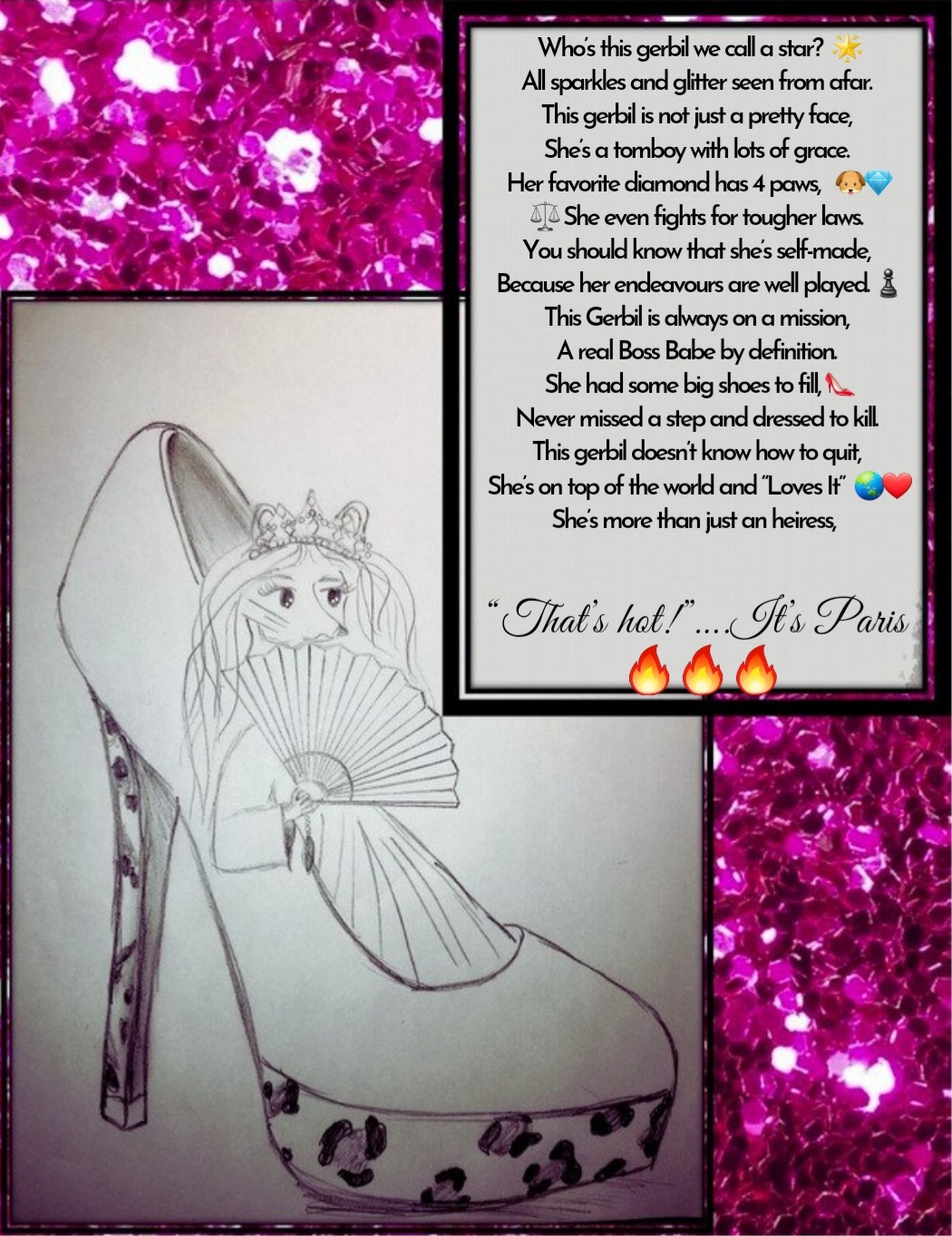 Who’s this gerbil we call a star? 🌟 All sparkles and glitter seen from afar. This gerbil is not just a pretty face, She’s a tomboy with lots of grace. Her favorite diamond has 4 paws, 🐶💎 ⚖ She even fights for tougher laws. You should know that she’s self-made, Because her endeavours are well played. ♟ This Gerbil is always on a mission, A real Boss Babe by definition. She had some big shoes to fill, 👠 Never missed a step and dressed to kill. This gerbil doesn’t know how to quit, She’s on top of the world and “Loves It” 🌏❤ She’s more than just an heiress, “That’s hot!”….It’s Paris 🔥🔥🔥